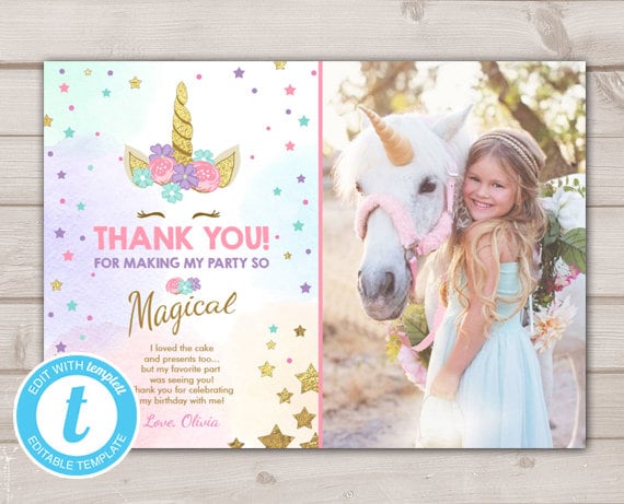Unicorn Thank You Card Template for Birthday Editable 5x7 | Etsy in 2020 | Thank you card ...